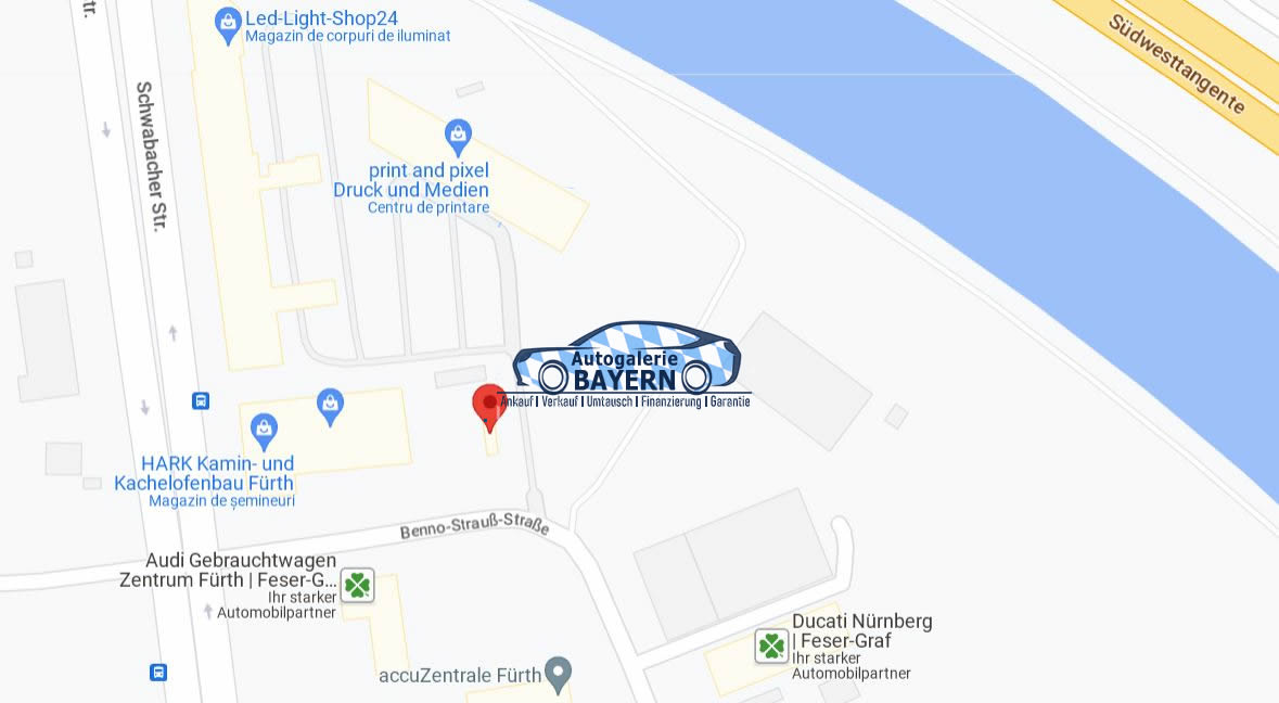 Addresse Benno-Strauß-Straße 3, 90768 Fürth, Deutschland Telefon +49 (0)911 62147180 Email kontakt@autogalerie-bayern.de Fax +49 (0)911 62147180 Öffnungszeiten